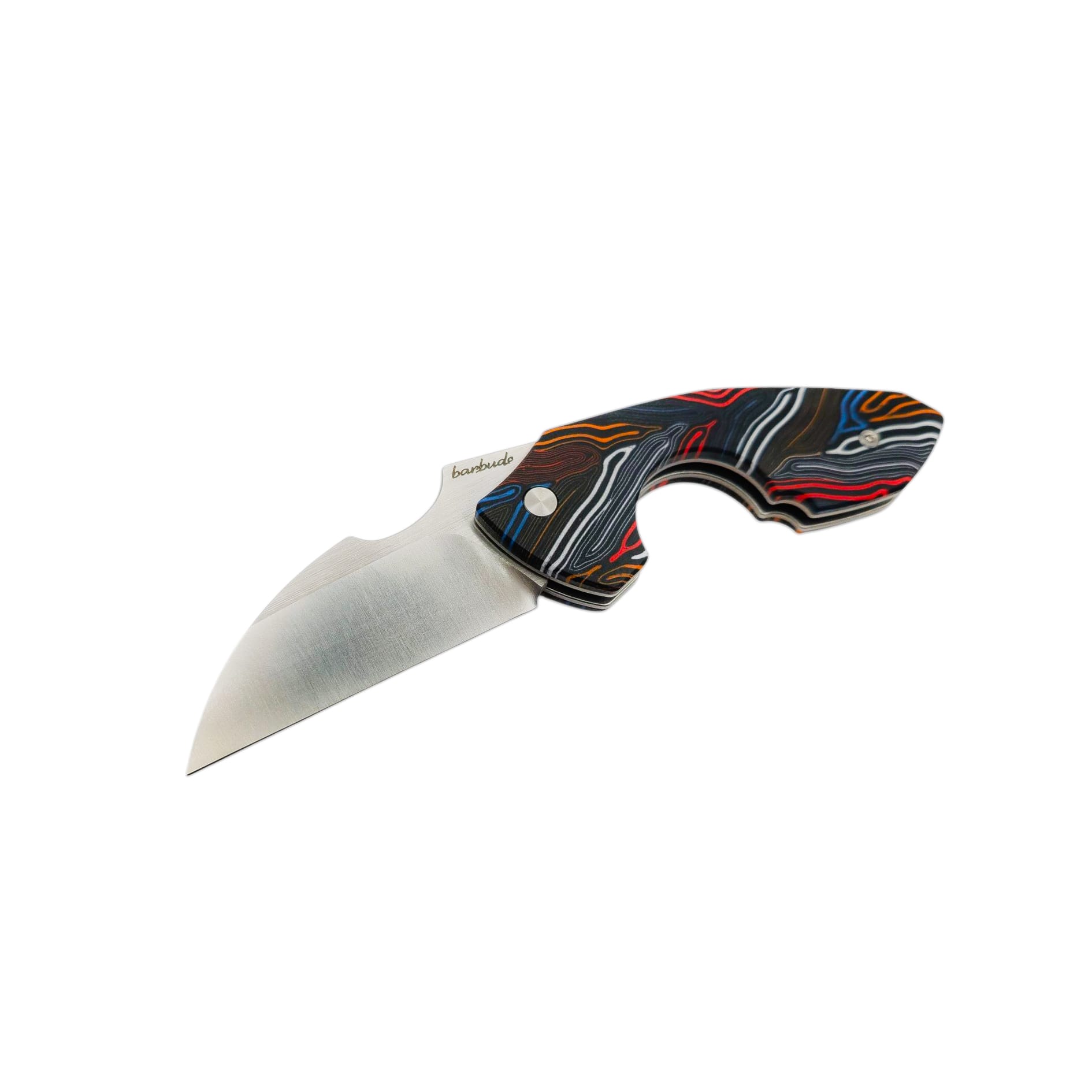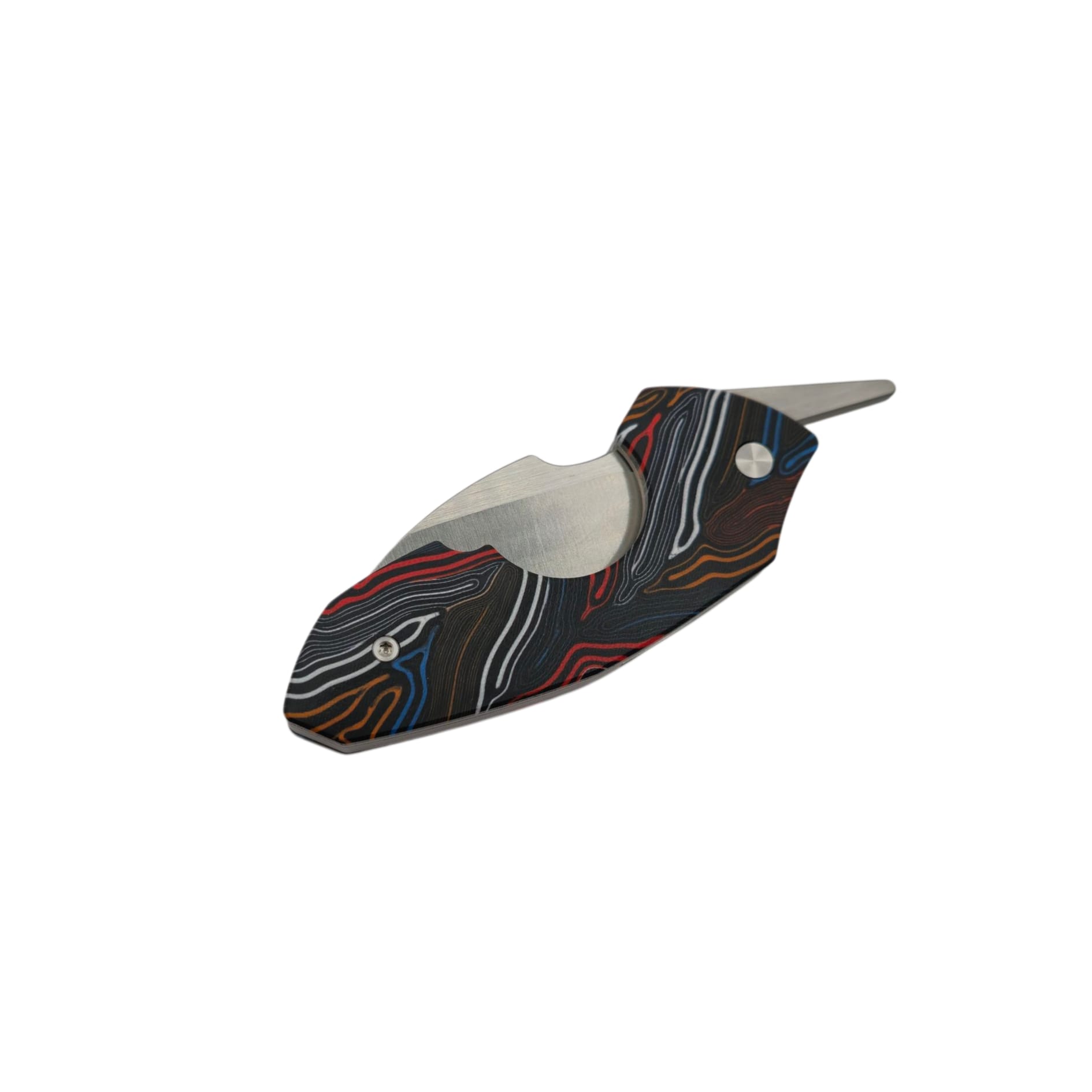 Für diese Variante fiel die Wahl auf buntes G10 – ein Material, das mit Farbe spielt, ohne an Klasse zu verlieren. Die lebendige Maserung bringt Dynamik ins Design, bleibt dabei jedoch klar und strukturiert. Von insgesamt vier Ausführungen zeigt diese am deutlichsten, dass Funktion auch Freude an Form bedeuten darf.