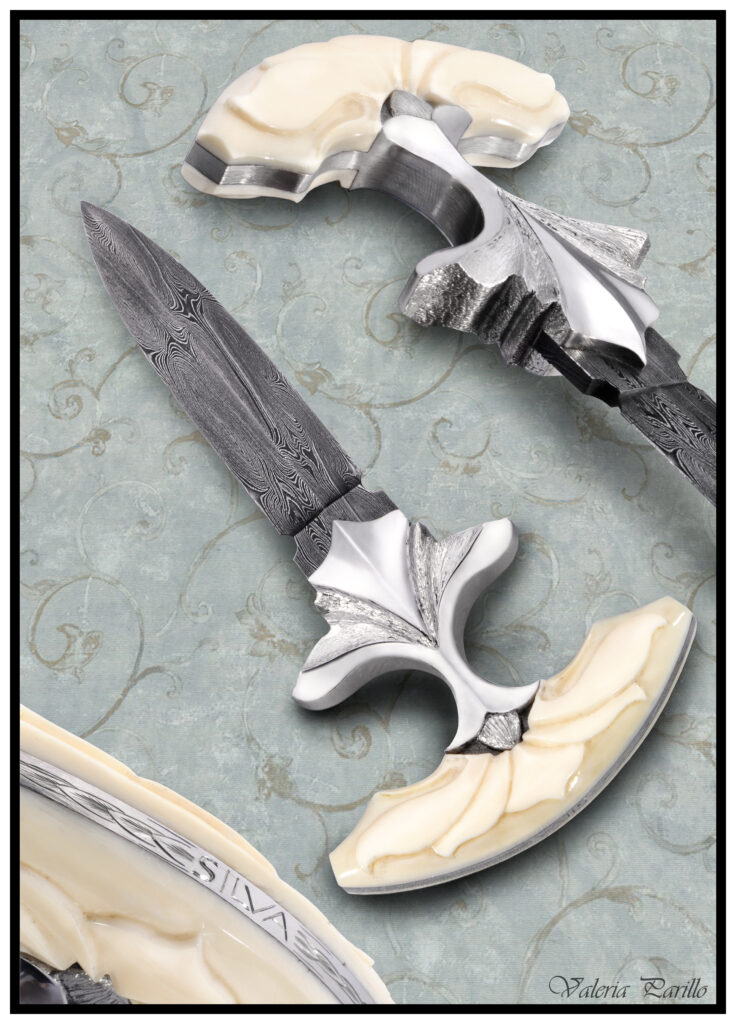 Cada cuchillo firmado por Silva nace de un proceso íntegramente artesanal, marcado por el dominio del acero, el control del fuego y una atención minuciosa al detalle. Sus piezas no se conciben como productos seriados, sino como obras únicas, donde la forma, el equilibrio y la ergonomía dialogan con una narrativa visual propia. En ellas, la utilidad no se opone a la belleza: la sostiene.El uso del scrimshaw, el grabado ornamental y la talla forma parte esencial de su discurso artístico. Estas disciplinas, aplicadas con rigor técnico y criterio estético, no actúan como mero ornamento, sino como elementos narrativos que aportan simbolismo, identidad y profundidad conceptual a cada pieza. El resultado son cuchillos que trascienden su función para convertirse en objetos cargados de memoria, carácter y significado.