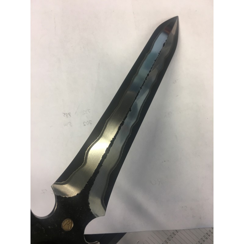 SanMai (carbon/austenitic) steel features a carbon (martensitic) core made of 1.2562, with stainless steel (austenitic) sides in a SanMai 3-layer pattern. Its surface is raw to the fire. It features SuperClean welds, a very fine grain and a reliable production process, which ensures high edge retention. It is priced per centimeter, offering a quality option for various applications.