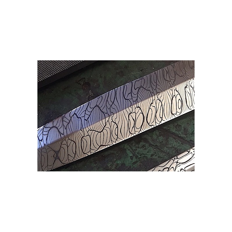Spirograph damascus (Inox) Flat Bars are products of exceptional quality, made of DSC inox (stainless) with a distinctive Spirograph pattern. With SuperClean layer welds and a very fine grain, these bars guarantee corrosion resistance and high edge retention. Suitable for food contact, they offer the possibility of high hardenability up to 62 HRC. Available in dark and glossy finishes, priced per centimetre or per piece.