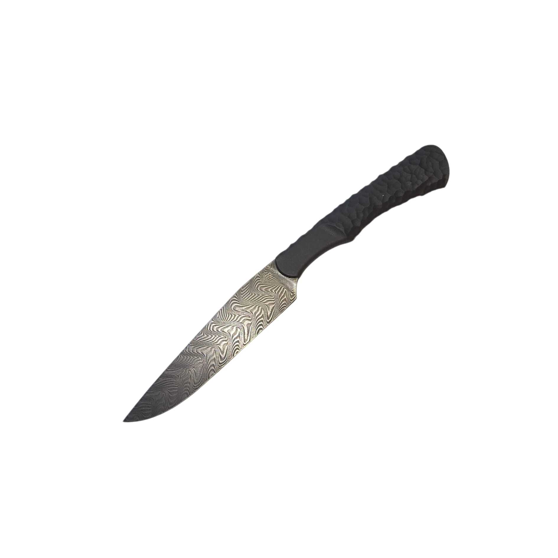 The TiSSK stands for “Titan Street Steak Knife” and impresses with its breathtaking blade made from Balbach Damascus. This exclusive Damascus steel is known for its exceptional beauty and striking pattern, which makes each knife unique. The 9 cm long blade radiates a timeless elegance, which is particularly accentuated in combination with the slim, gray titanium handle. With a blade thickness of 2.2 mm and a total weight of just 40 grams, the TiSSK offers a perfect balance between lightness and stability.