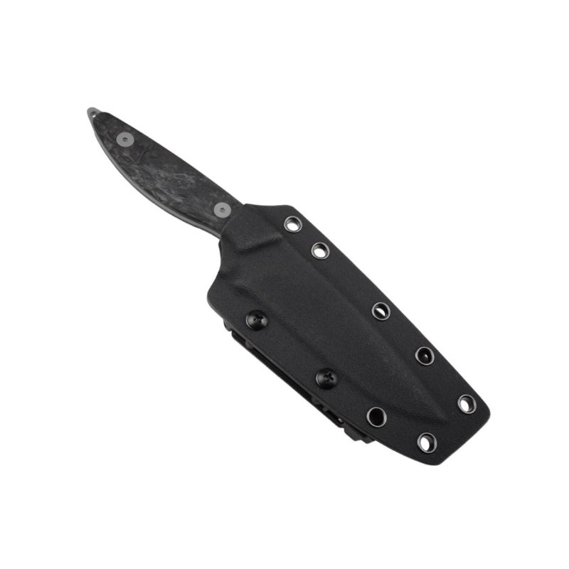 The handle scales are made from the breathtaking and elegant Dark Matter Black, which we source from our valued partner Fatcarbon in Lithuania. Fatcarbon is known for its unique and high-quality carbon variants, which make every knife a special highlight.But Fatcarbon not only looks really good, it also fits perfectly in the hand. Many people think this knife is a little unwieldy at first glance, as it is very flat and slim, but after the first fumble it wins over every skeptic.